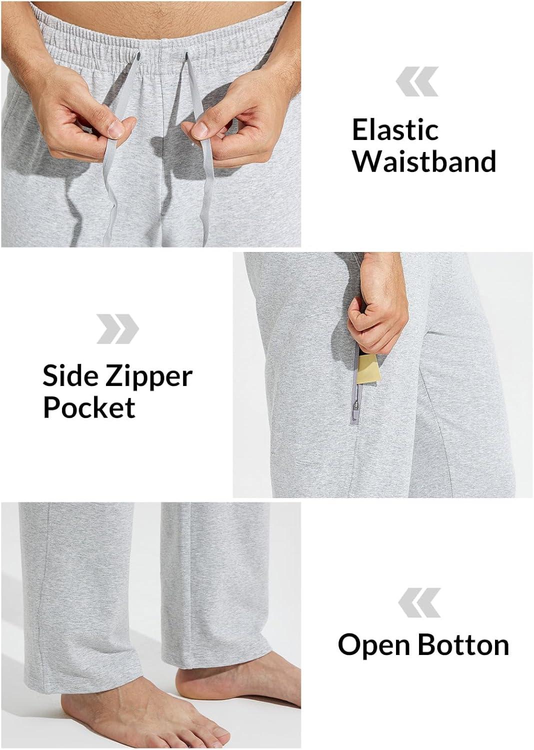 baleaf Men’s Sweatpants Yoga Lounge Cotton Pajama Pants Casual Open Bottom Straight Leg Stretchy Sweat Pants with Pockets(B-light Gray-zipper Pocket)
