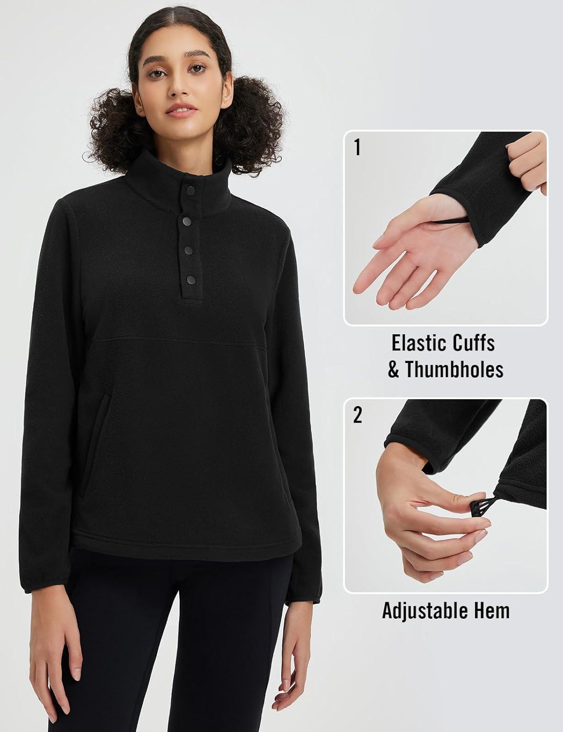 baleaf Women’s 1/4 Buttom Down Fleece Pullover Thermal Long Sleeve Shirts Ski Mid Layer with Pockets Thumbhole Warm Tops(Black)