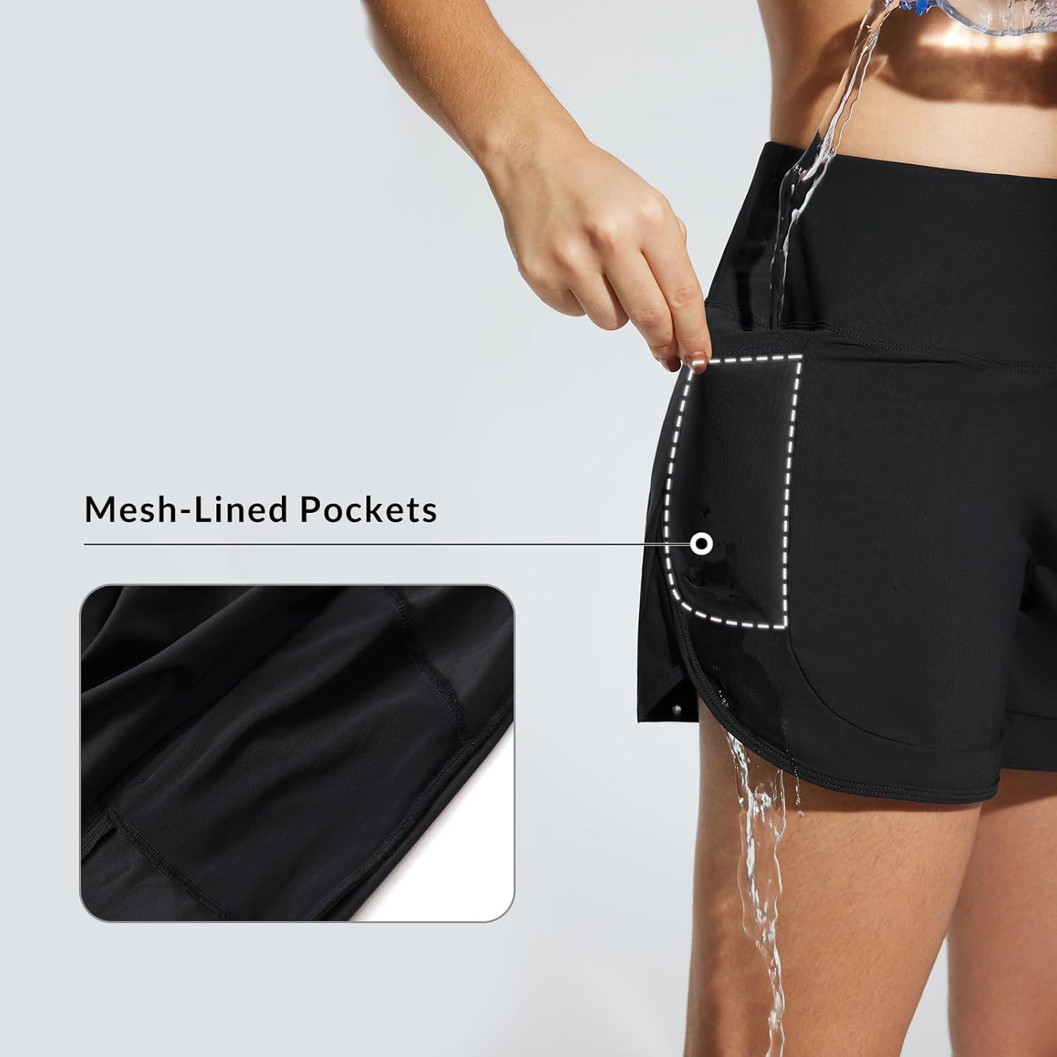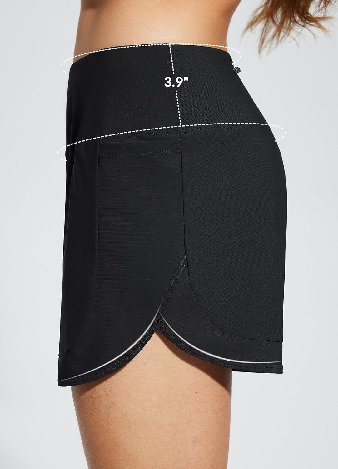 BALEAF Women’s 4″ High Waisted Swim Shorts Quick Dry Board Shorts UPF50+ Swimsuit with Liner and Pockets(Black)