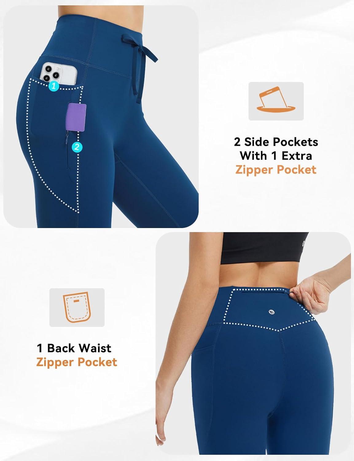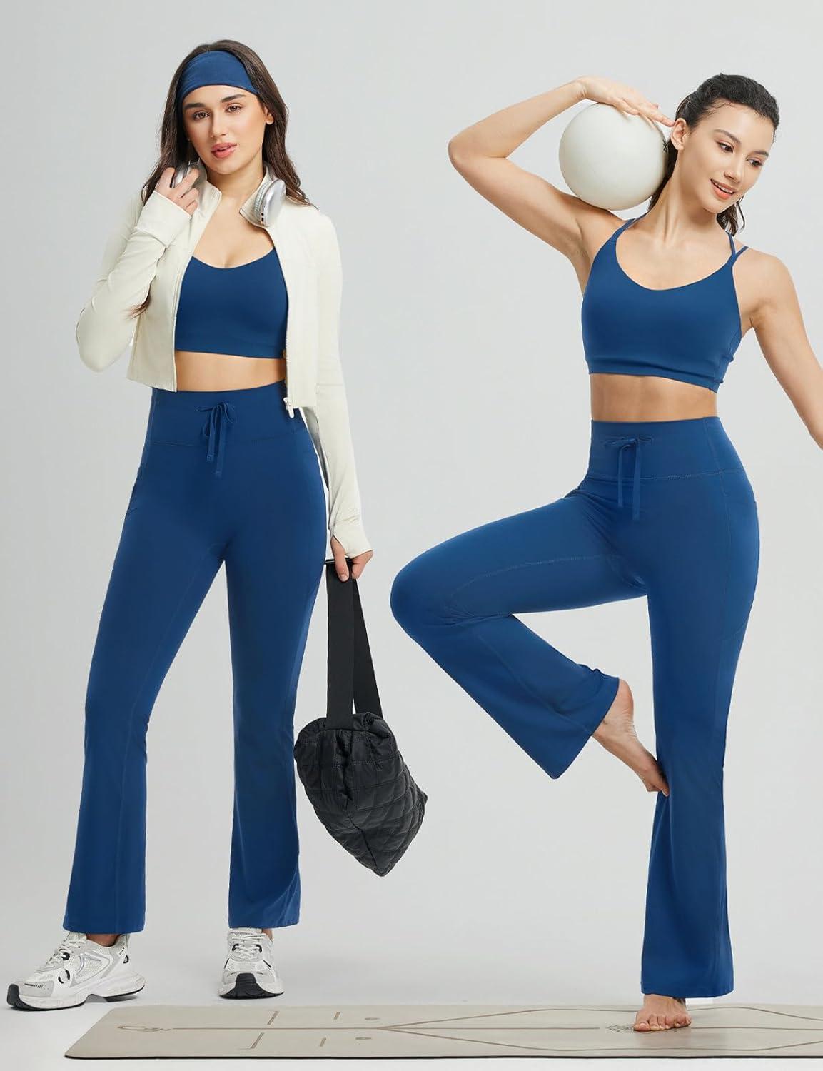 imagebaleaf Womens Flare Leggings with Zipper Pockets Drawstring Flared Yoga Pants Bell Bottom Leggings Tummy ControlNavy Blue