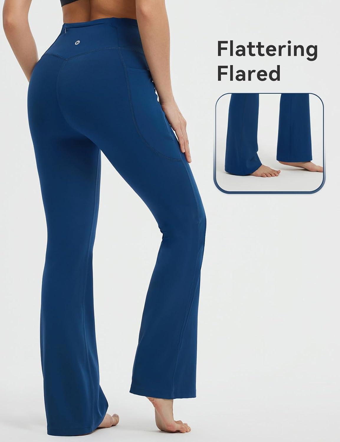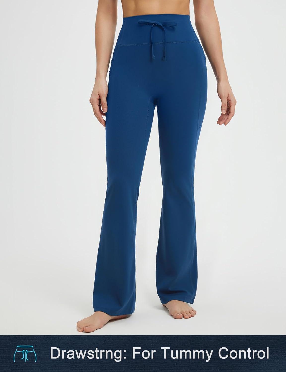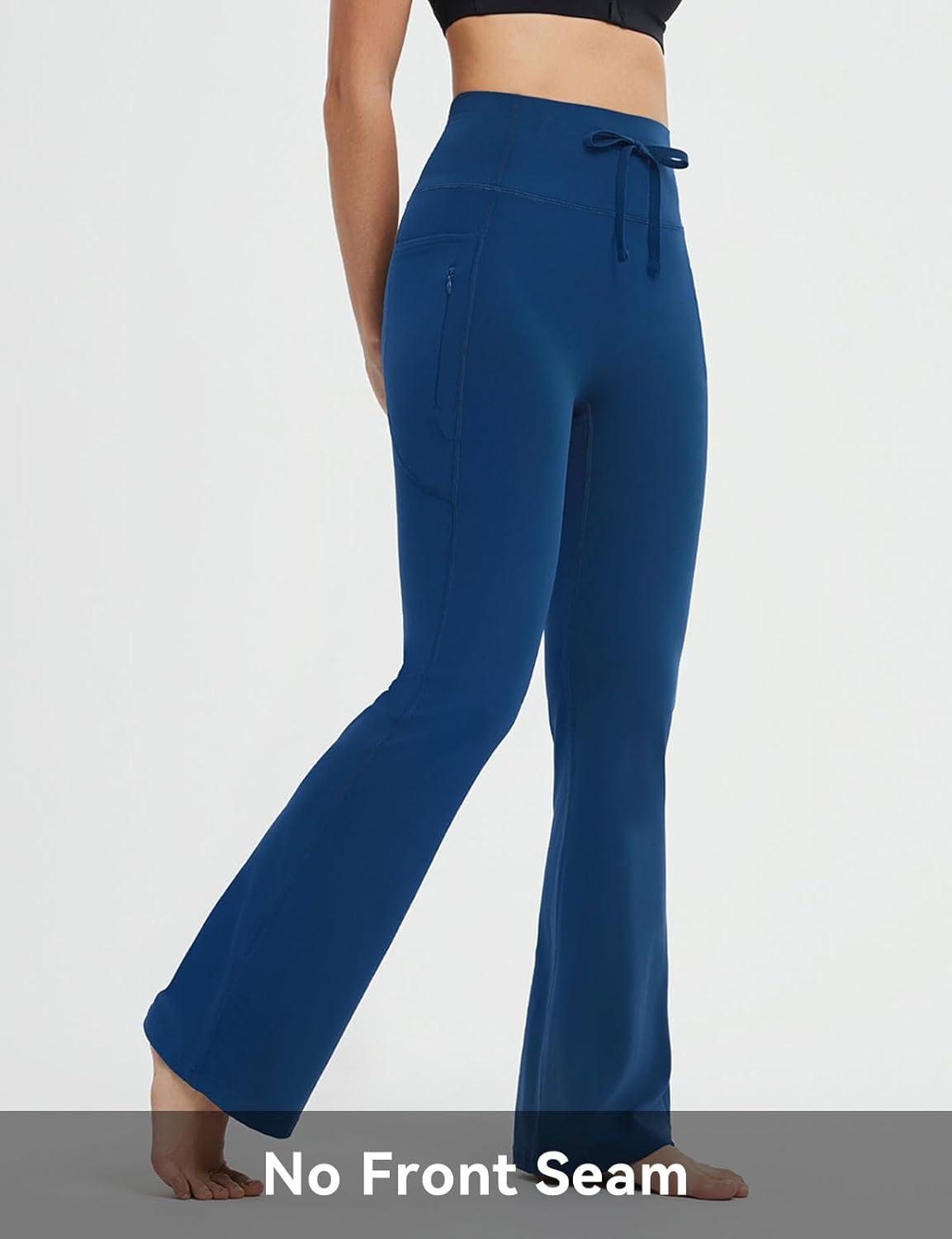 baleaf Womens Flare Leggings with Zipper Pockets Drawstring Flared Yoga Pants Bell Bottom Leggings Tummy Control(Navy Blue)
