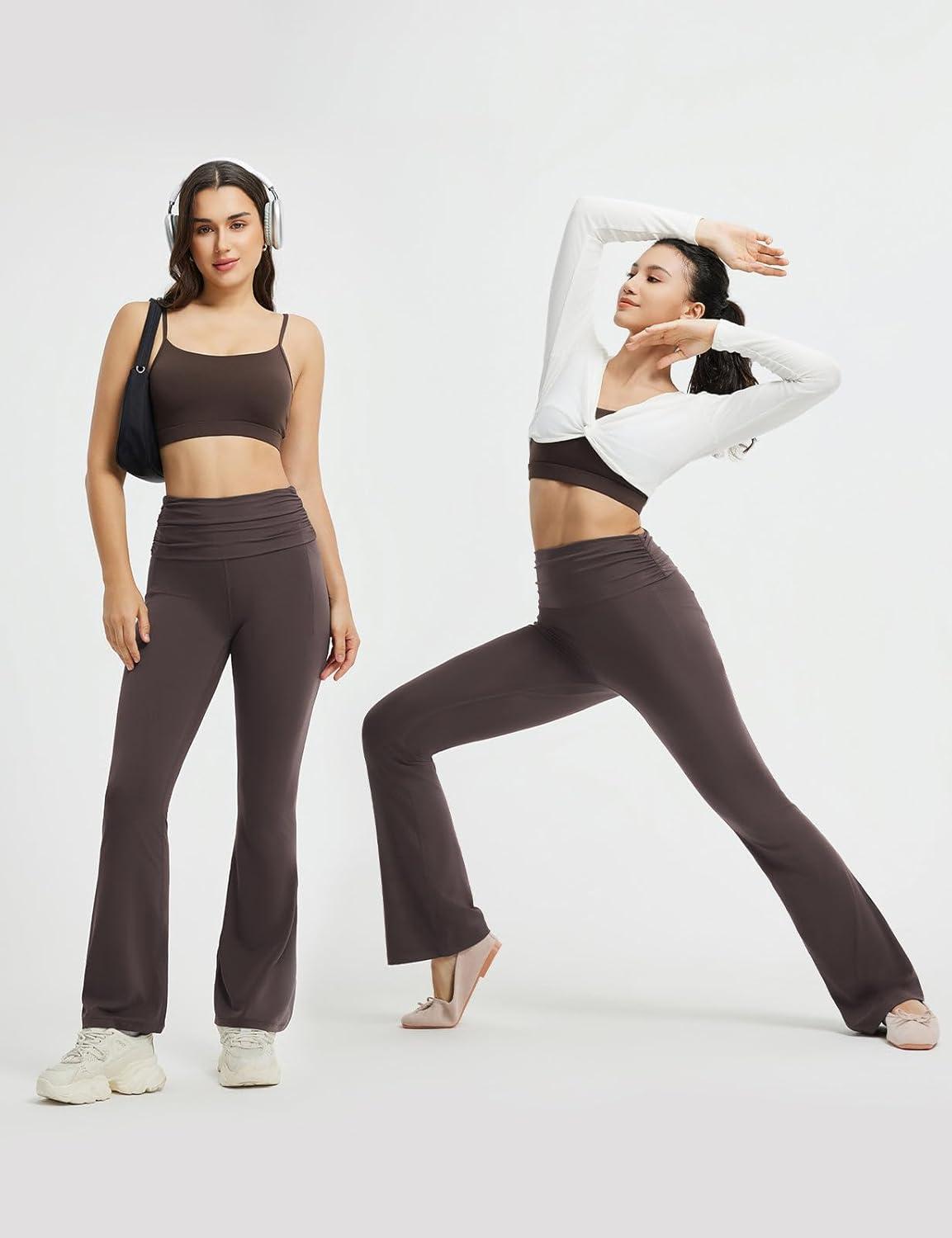 imagebaleaf Womens Flare Yoga Pants Fold Over Flared Leggings with Pockets Tummy Control Bootcut PantsSeal Brown