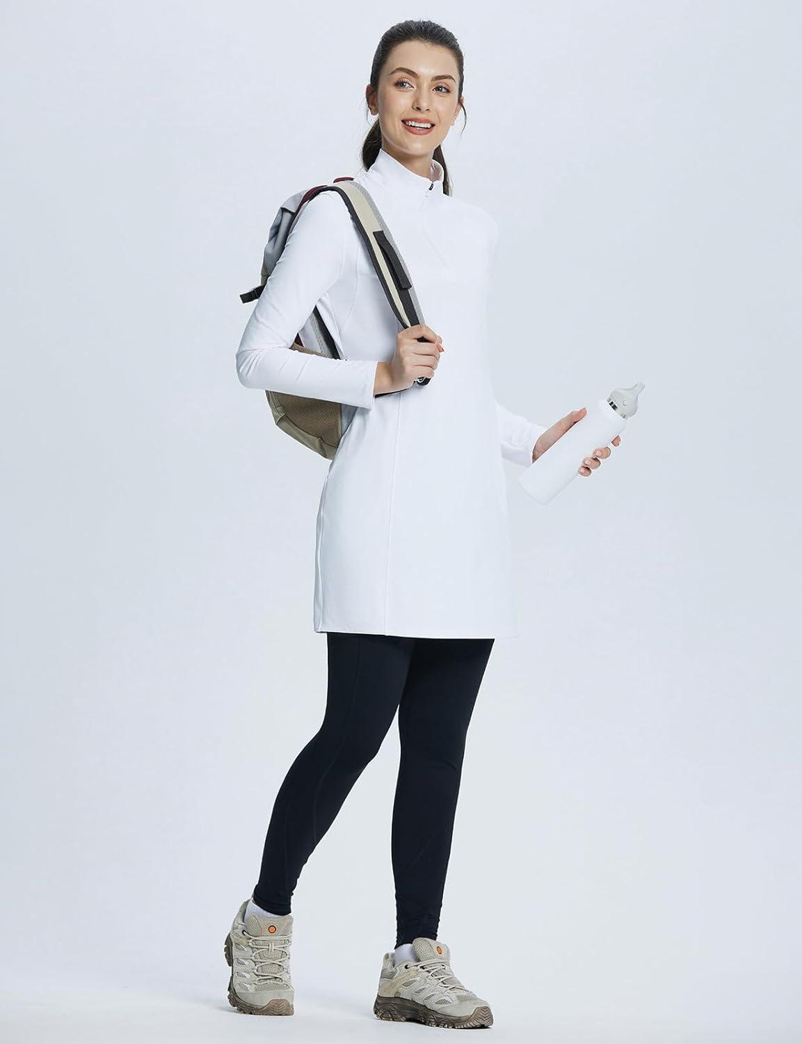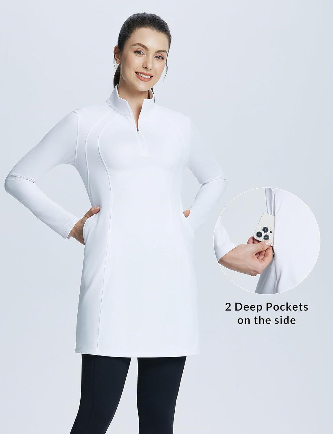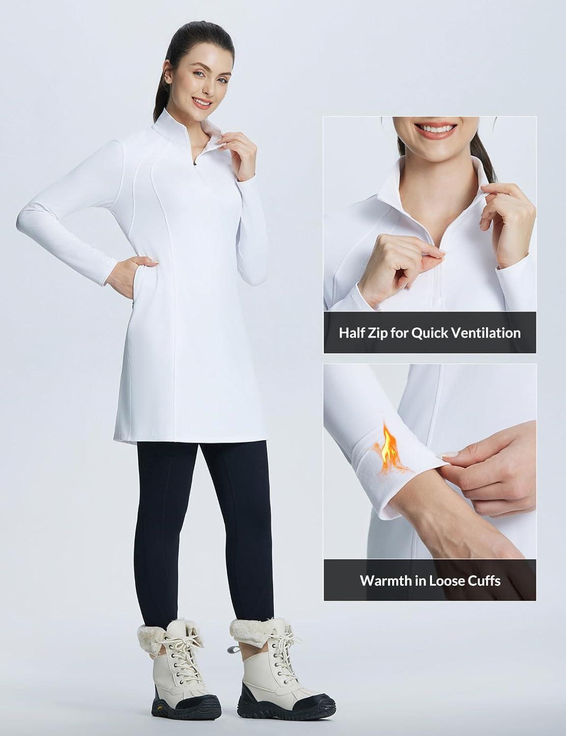 baleaf Women’s Fleece Dress Sweatshirt Winter Dress Tunic Long Warm Quarter Zip Up Pullover Jackets with Pocket Outdoor(White)