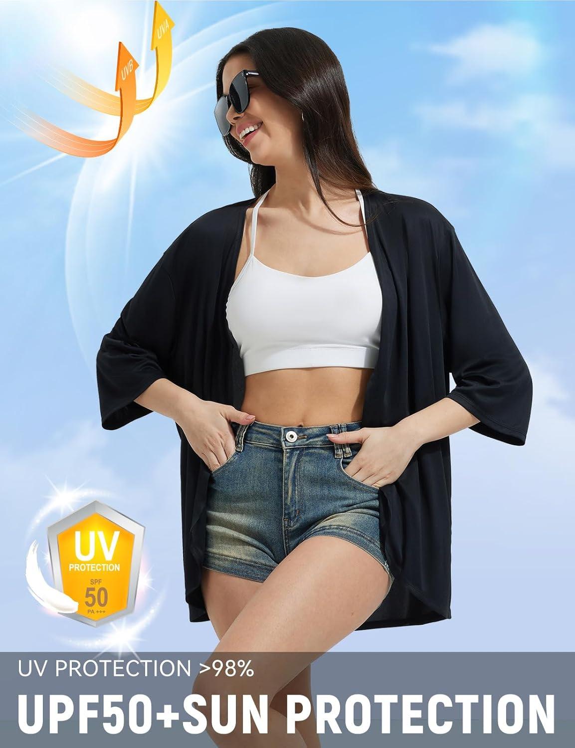 baleaf Women's Long Sleeve Sun Shirts UPF 50+ Lightweight Open Front Cardigan with Pockets Beach Cover Up SPF Sun Wrap(Black-3/4 Sleeve)