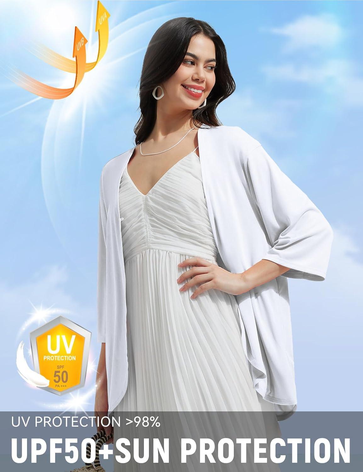 baleaf Women's Long Sleeve Sun Shirts UPF 50+ Lightweight Open Front Cardigan with Pockets Beach Cover Up SPF Sun Wrap(White-3/4 Sleeve)