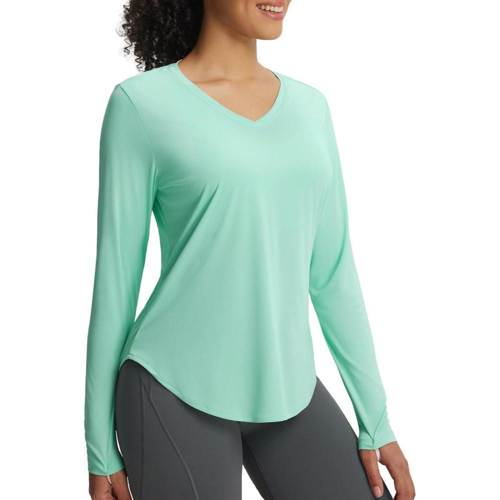 imagebaleaf Womens Long Sleeve V Neck Sun Shirts UPF50 Lightweight Quick Dry UV Protection Rash Guard Workout Hiking Running TopLight Green