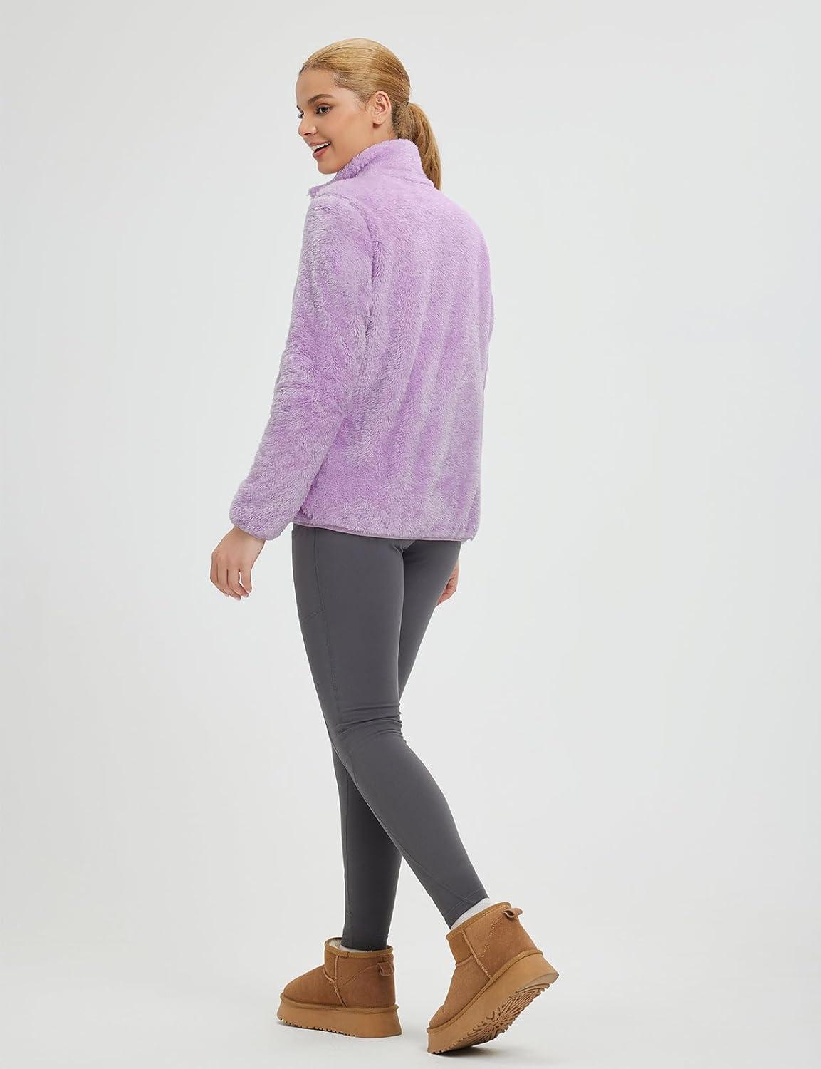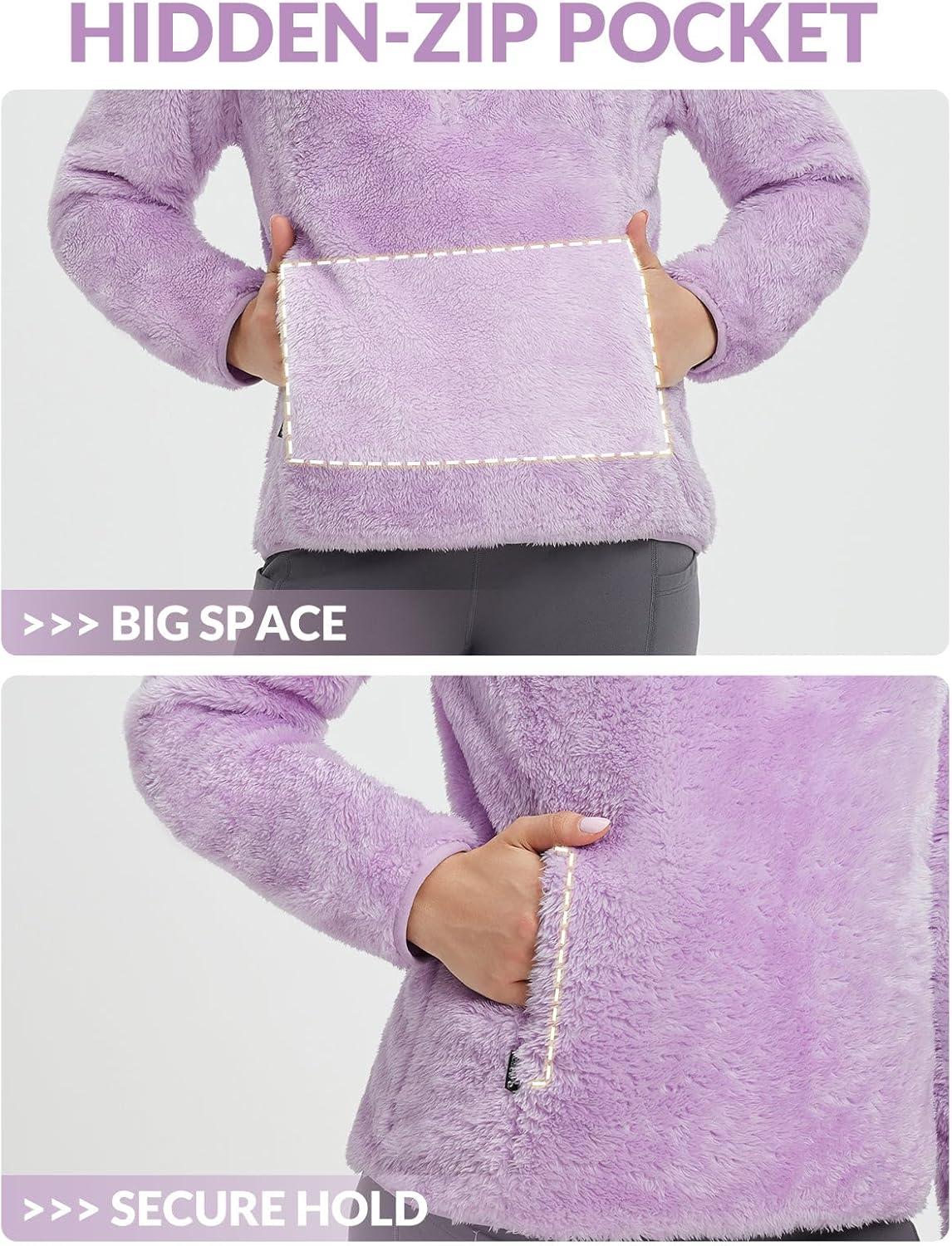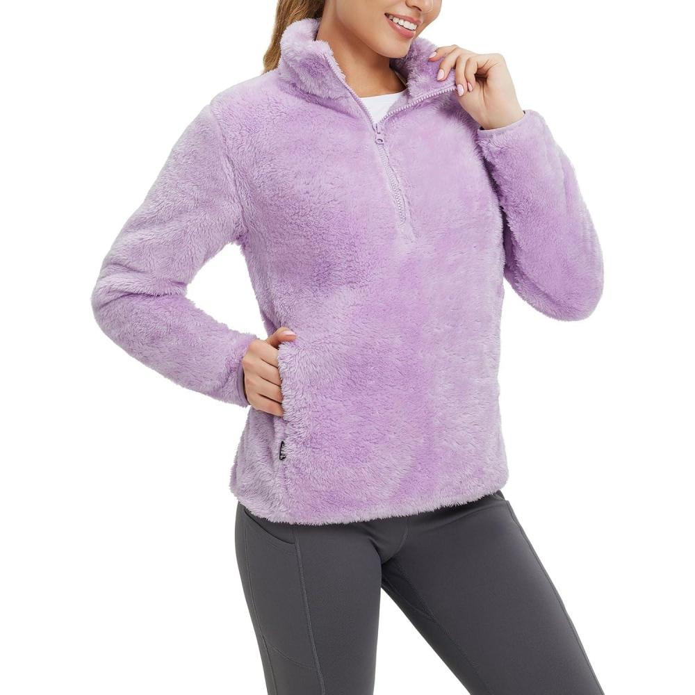 baleaf Women’s Quarter Zip Sherpa Fleece Pullover Lightweight Fuzzy Winter Warm Sweatshirt with Zipper Kangaroo Pocket(Light Purple)