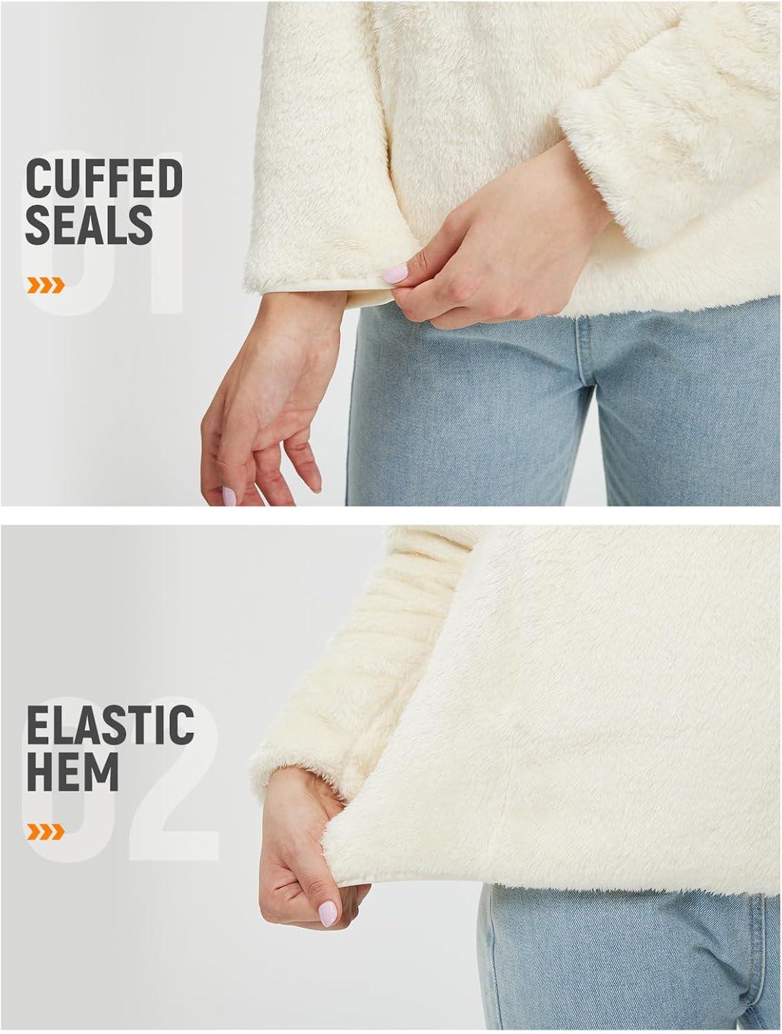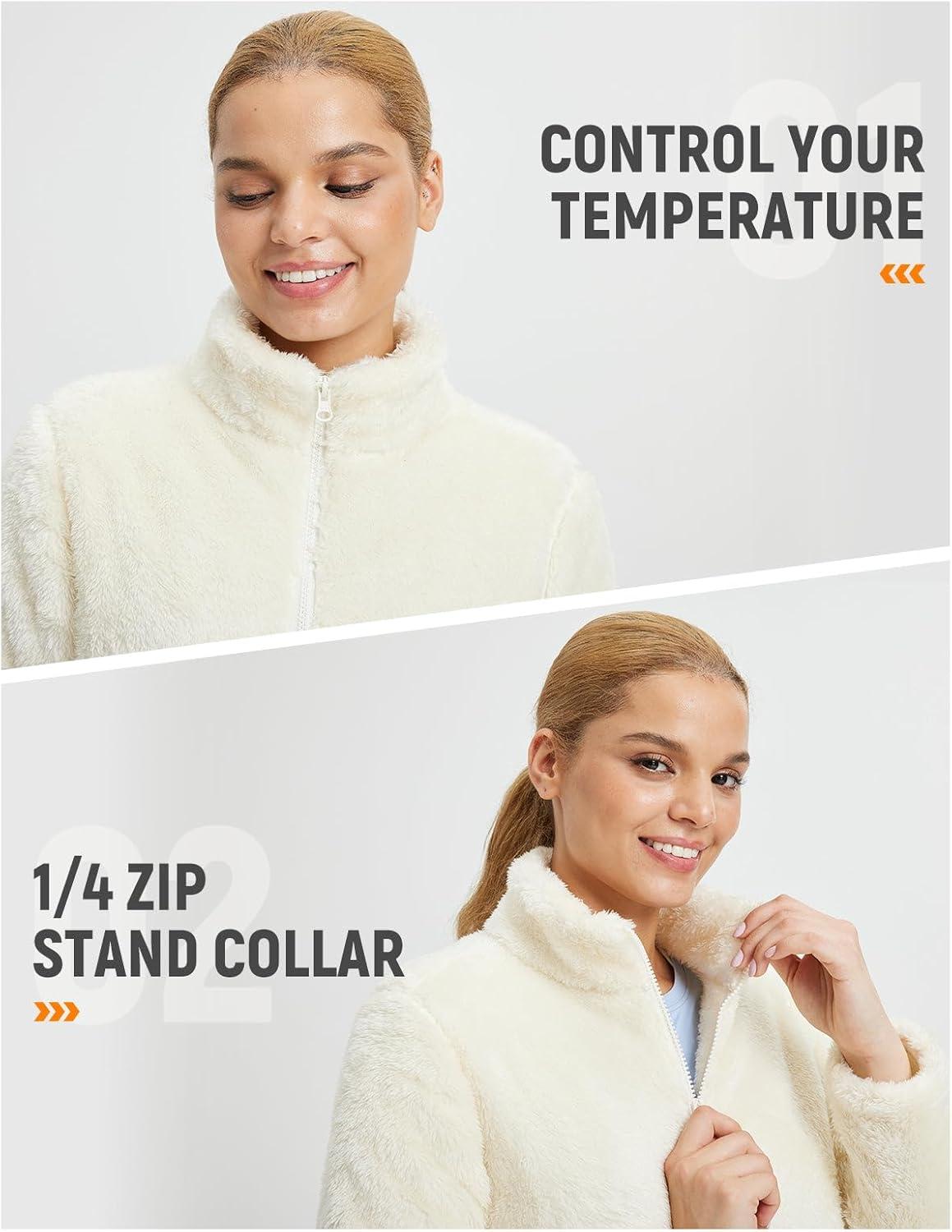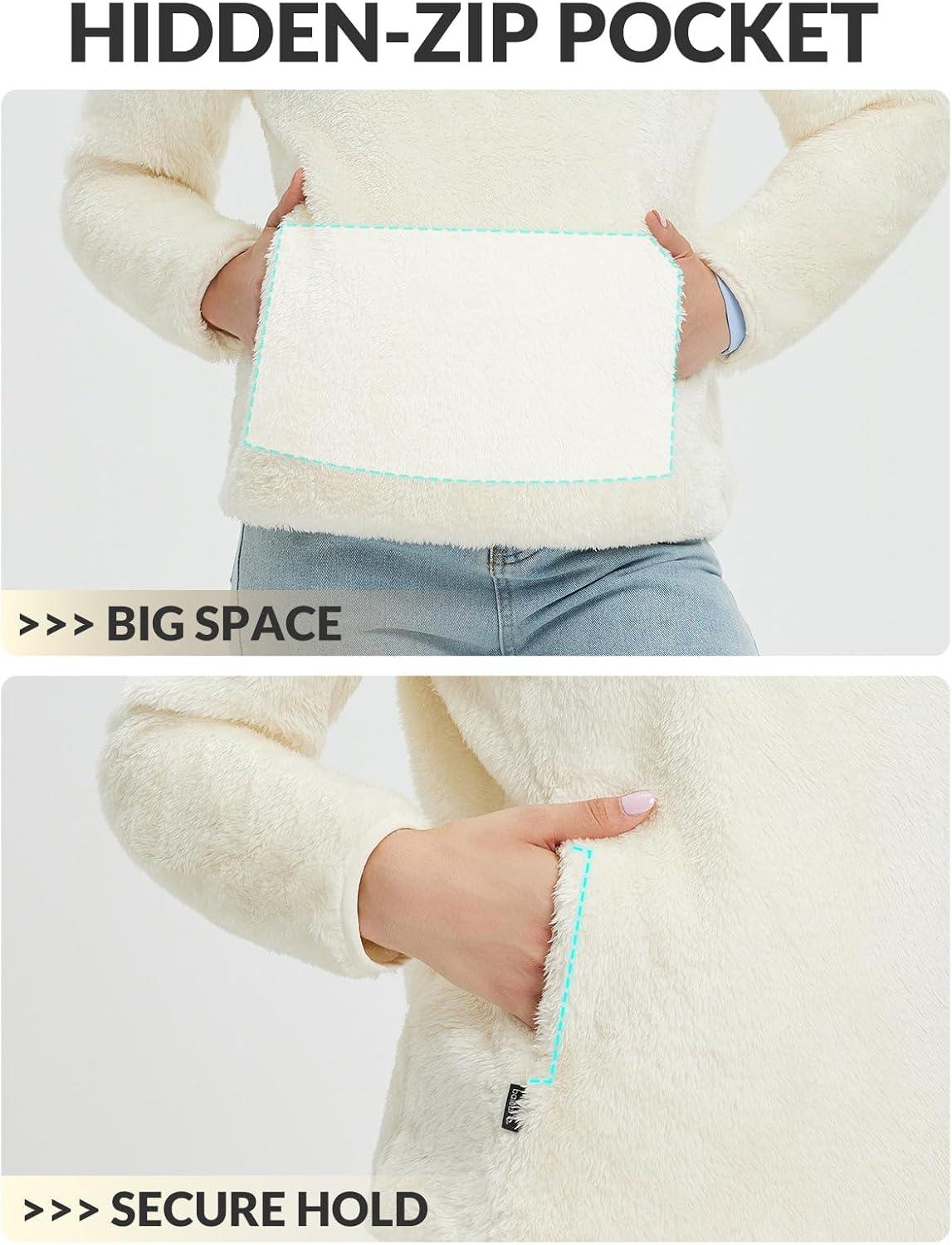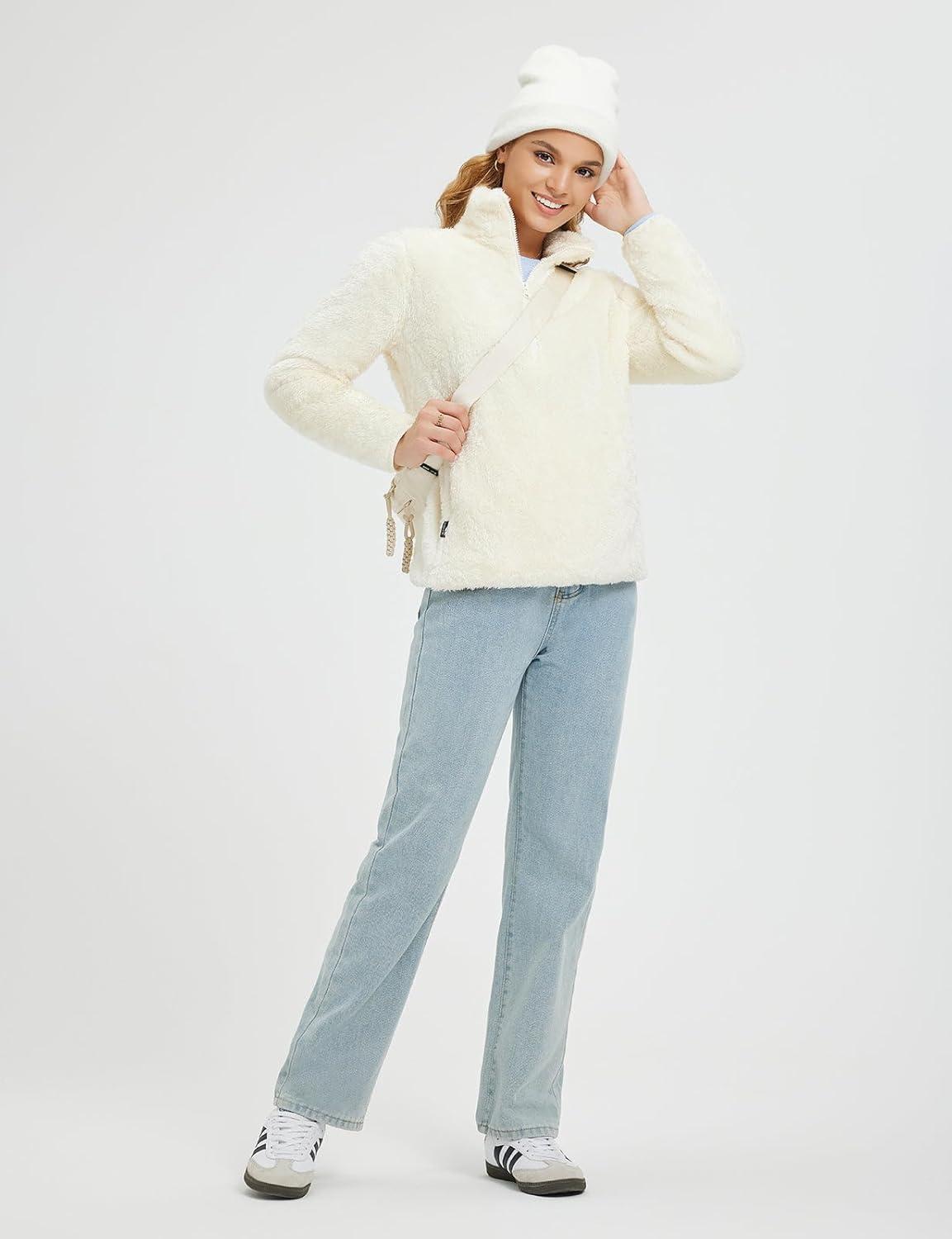 baleaf Women’s Quarter Zip Sherpa Fleece Pullover Lightweight Fuzzy Winter Warm Sweatshirt with Zipper Kangaroo Pocket(Star White)