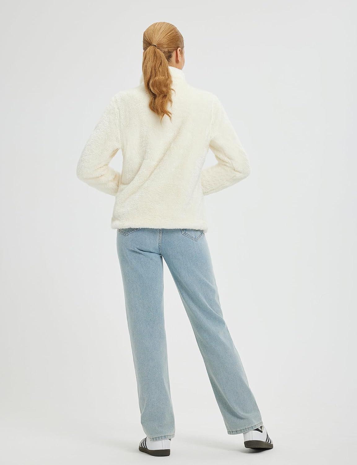 baleaf Women's Quarter Zip Sherpa Fleece Pullover Lightweight Fuzzy Winter Warm Sweatshirt with Zipper Kangaroo Pocket(Star White)