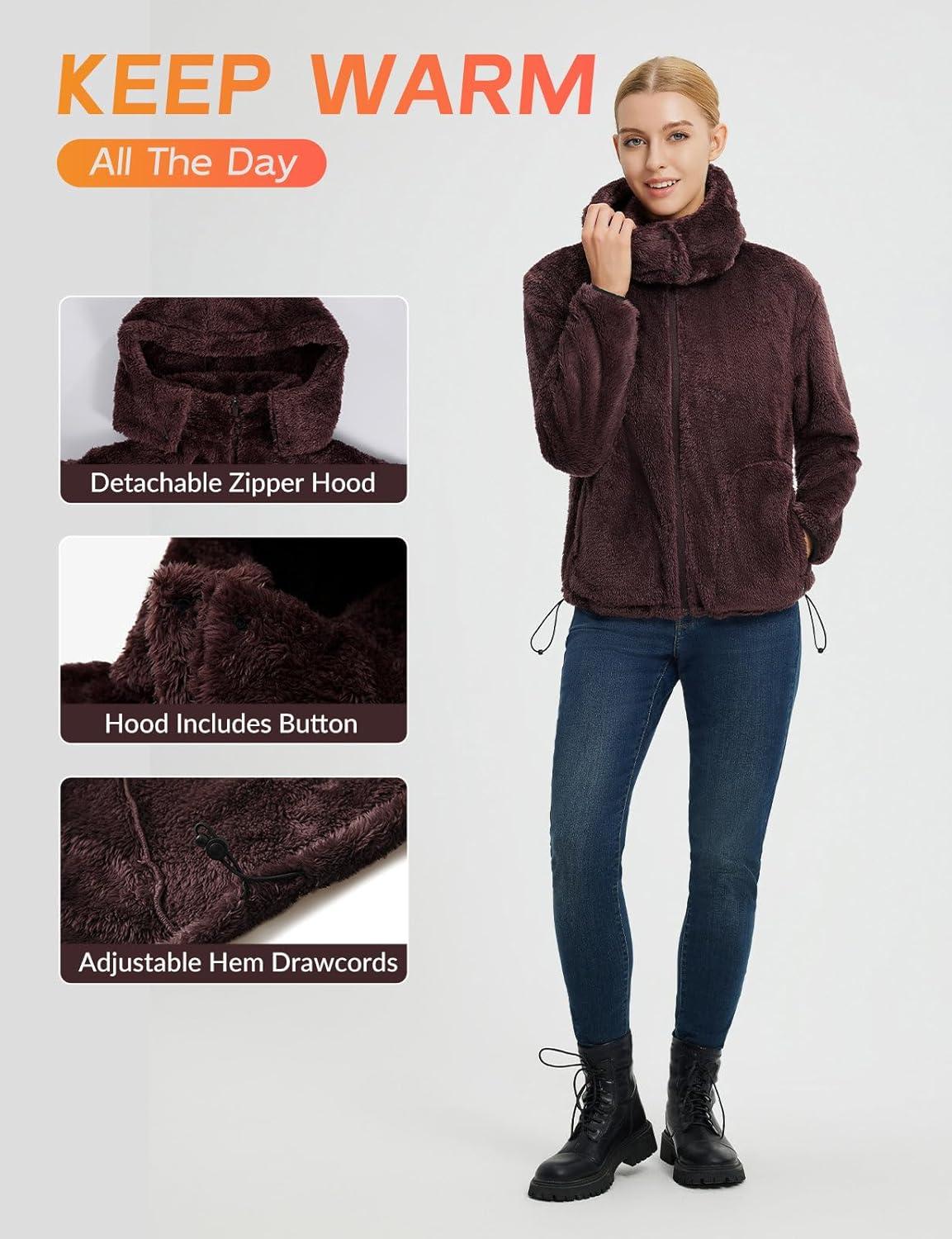 baleaf Womens Sherpa Fuzzy Fleece Jakcets with Hood Button Down Drawstring Winter Casual Warm Coat with Pockets(Dark Brown)