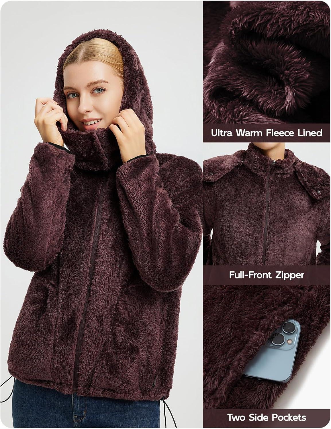 baleaf Womens Sherpa Fuzzy Fleece Jakcets with Hood Button Down Drawstring Winter Casual Warm Coat with Pockets(Brown)