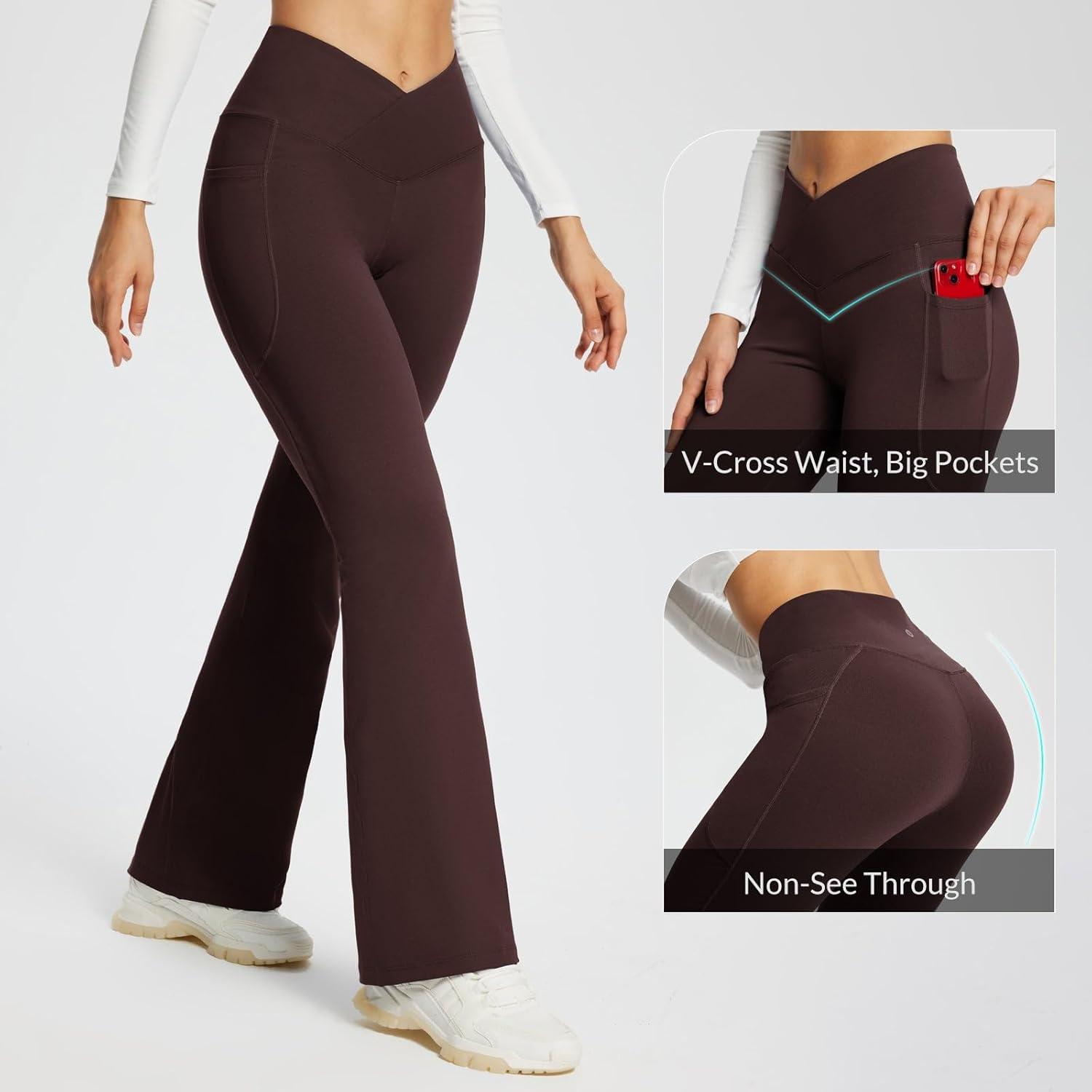 imagebaleaf Womens V Crossover Flare Leggings with Pockets Yoga Pants High Waist Casual Workout Gym Bell Bottom LeggingsBrown