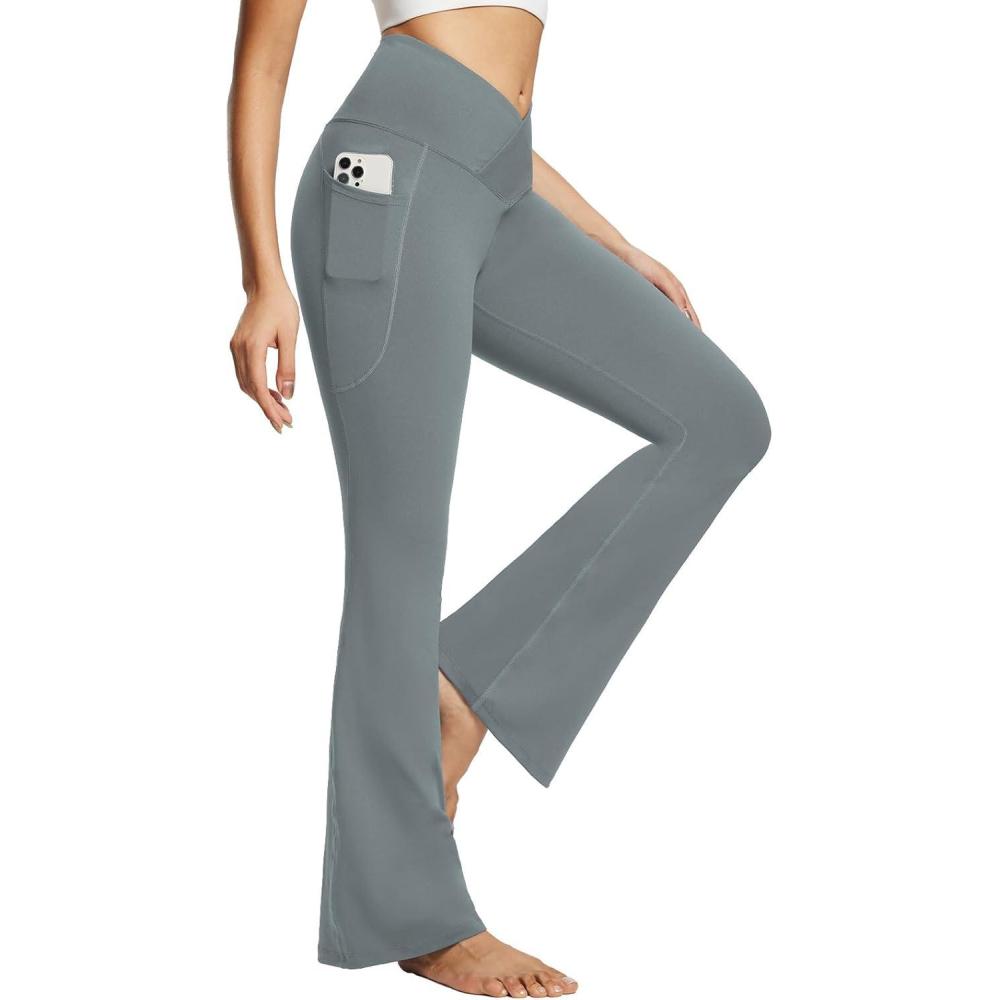 baleaf Women’s V Crossover Flare Leggings with Pockets Yoga Pants High Waist Casual Workout Gym Bell Bottom Leggings(Light Grey)