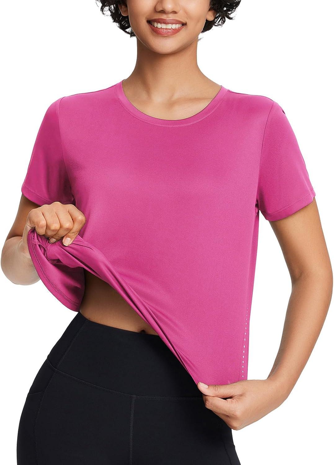 imagebaleaf Womens Workout Tops Athletic Shirts Cropped Short Sleeve Split Back Running Gym Quick Dry Sun Protection UPF 50Rose Red